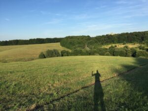 Fast am höchsten Punkt angelangt (ich komme von links hoch und rennen dann gradeaus weiter) und auch schlecht zu sehen: kurz hinter dem Sonnenschein ist nochmal eine kleine fiese Steigung. Anfangs konnte ich den Teil nie laufen, mittlerweile ist der Ehrgeiz stärker. Das sind auch so die Stellen an denen ich merke wie gut meine Tagesform bzw. die Gesamtkondition ist. Zur Zeit: spitze 🙂