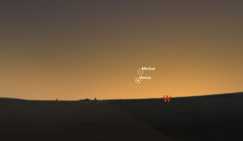 Wer in diesen Tagen bei klarer Luft und wolkenfreiem Himmel kurz nach Sonnenuntergang in Richtung Westen schaut, dem bietet sich möglicherweise ein wunderschöner Anblick: die helle Venus und der flüchtige Merkur dicht beieinander. Gegen Monatsmitte, am 18., wird Merkur in der beginnenden Dunkelheit am besten sichtbar sein, sofern das Wetter mitspielt.