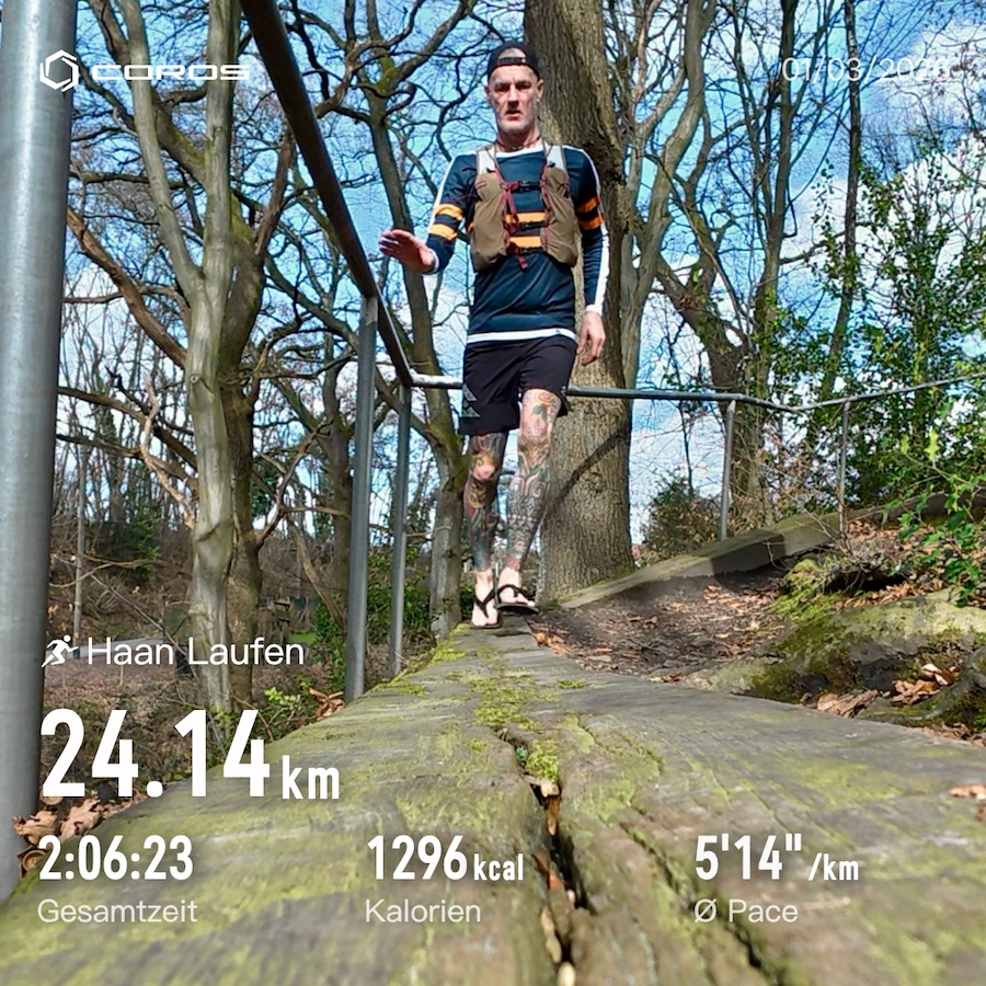 Für den 01.03. schließlich hatte ich mir die Halbmarathon Distanz als Test gesetzt, aber eher „gemütlich“, keine Tempo-Spinnereien. Also zuerst zum Frühstück bei Schwiegerfamilie nach Haan fahren und danach zurück laufen. Hab ich schon öfter gemacht, es gibt ein paar Routen-Möglichkeiten. Das fiese Auf und Ab im Neandertal wollte ich mir sparen, also gings auf die „Unterbacher-Route“. Die Strecke ist toll zu laufen, da es eigentlich nur bergab geht und überwiegend wirklich sehr schön ist. Teils singletrailig, durch Bachtäler, Felder und Wald, aber zum Schluß natürlich wieder Asphalt. Und weil ich so oft auf den Auslöser der Actioncam gedrückt hab, bot es sich an einen kleinen Clip zu basteln: