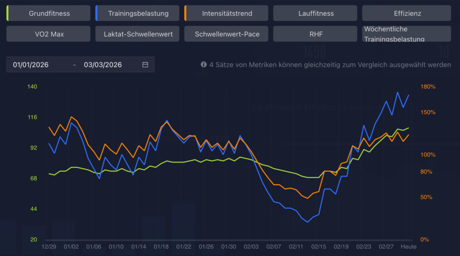 Danke und gerne 🙂 Die Kurve ist aktuell wieder etwas zickig, das Frühjahr ist durchaus zäh diesmal. Diese schönen einfachen bunten Kurve bietet mir das Coros „Trainings-Hub“, gehört also zur Uhr. Als Trainingstool nutze ich das nicht (weil keine Trainingspläne), aber so als Trend kann man da schnell viel erkennen.